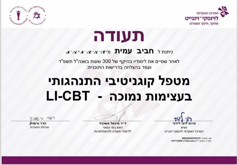שמי עמית חביב, בוגר תואר ראשון (B.A), ומטפל מוסמך בשיטת LICBT, טיפול קוגניטיבי-התנהגותי בעצימות נמוכה.